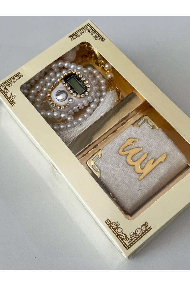 10 Adet Hediyelik Çeyizlik Kutulu Mini Kur'an-ı Kerim Tesbih Ve Taşlı Zikirmatik Setimiz Krem renk seçeneğiyle zarif bir görünüm sunan mini Kur'an