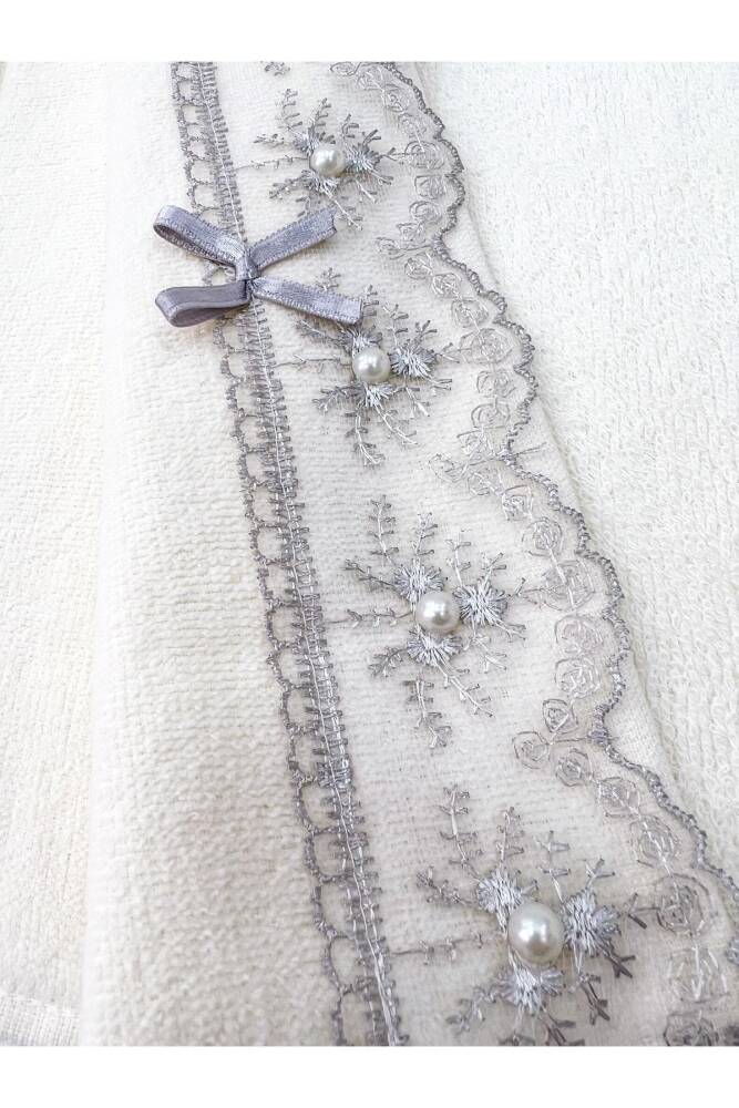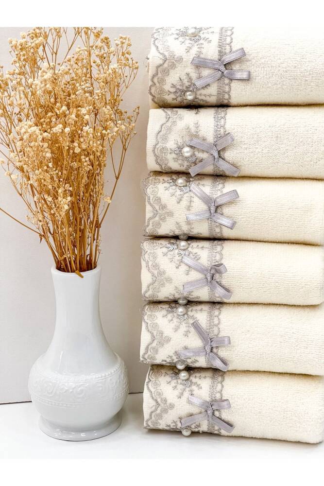 Nakışlı ve işlemeli deseniyle mutfak dekorasyonunuza şıklık katan 6'lı güpürlü fiyonklu kadife havlu seti