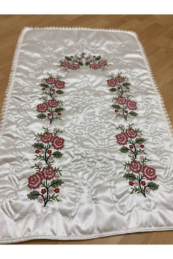 Özel günlerinizde şıklığınızı tamamlayacak, krem ve kırmızı renk kombinasyonuyla zarif bir görünüm sunan kaneviçe ışleme nakışlı saten seccade