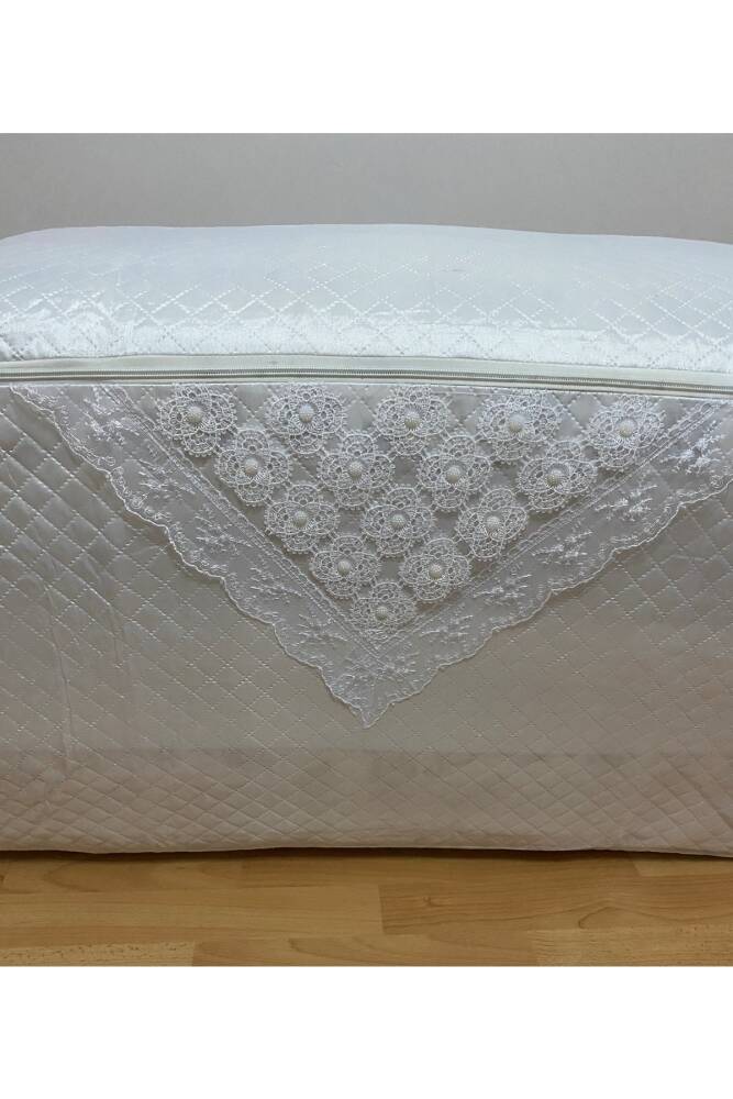 Yumuşak dokusuyla dikkat çeken incili saten krem yorgan hurcu, çeyizlik ve bohçalık ihtiyaçlarınız için ideal bir seçimdir
