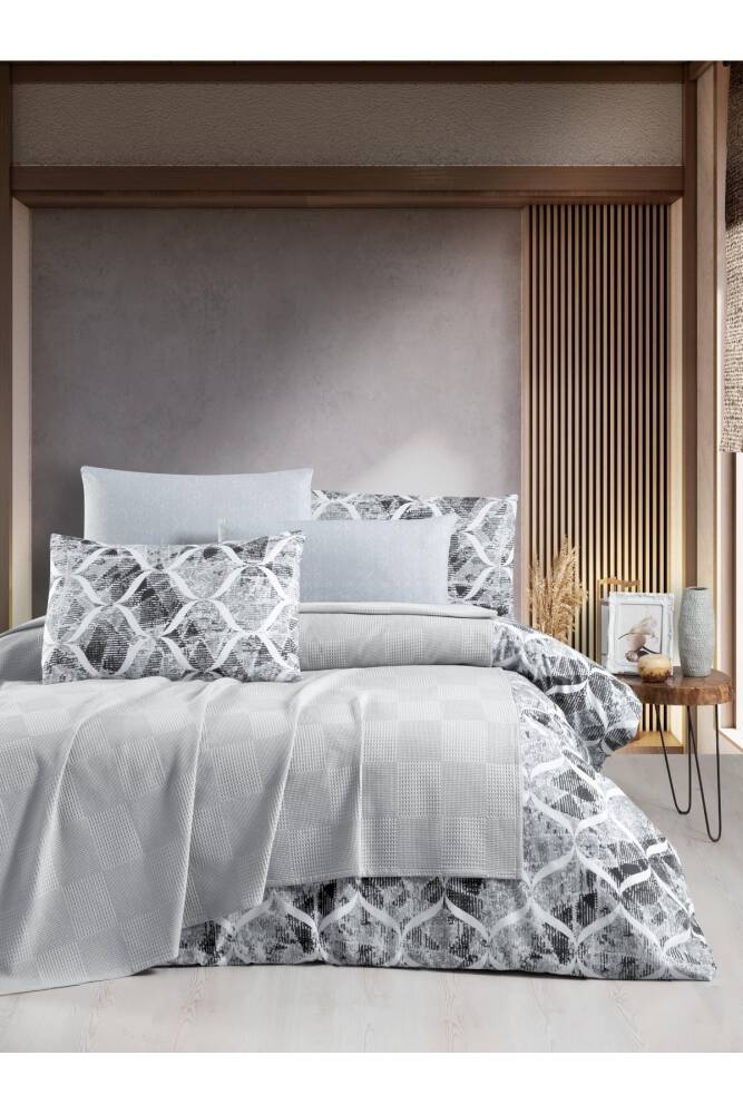 Waffle Desen Pamuklu Çift Kişilik Pikeli 5 Parça Nevresim Takımı (Gri)