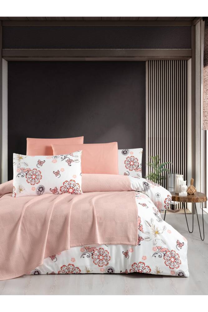 Waffle Desen Pamuklu Çift Kişilik Pikeli 5 Parça Nevresim Takımı (Pembe)