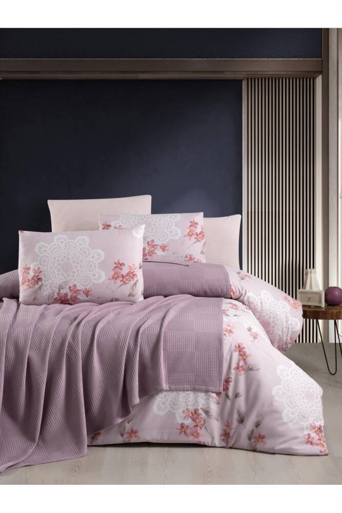 Waffle Desen Pamuklu Çift Kişilik Pikeli 5 Parça Nevresim Takımı (Mor)